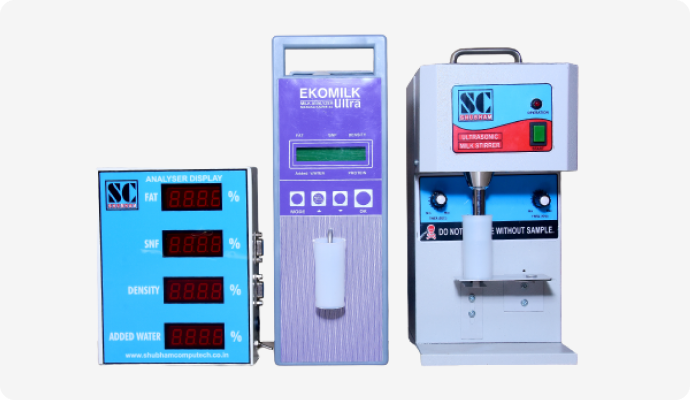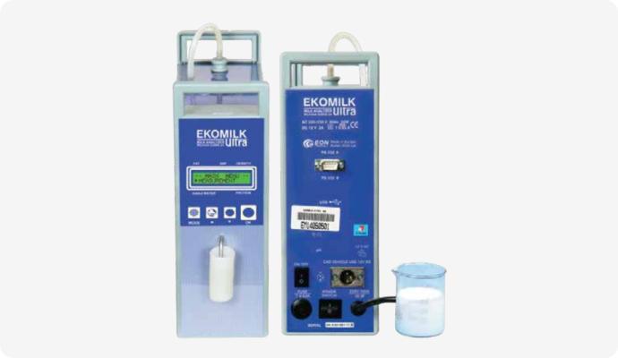 Integrated system which includes Ekomilk Ultra MB to simultaneously analyze Fat and SNF accurately and swiftly with a measurement time of less than 40 seconds,stirrer for better and accurate analysis of milk and a remote display which displays parameters like FAT,SNF,Density and added Water.